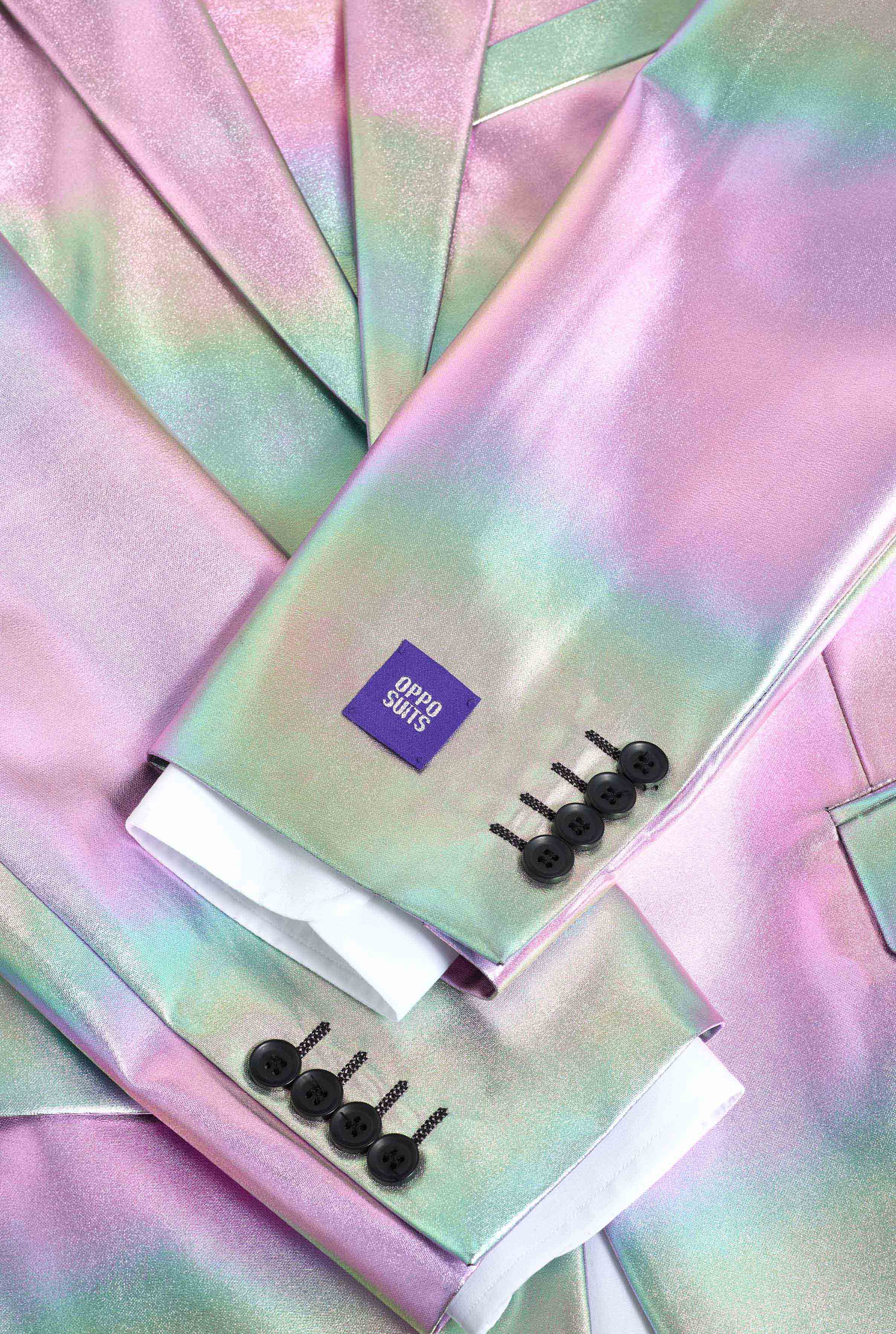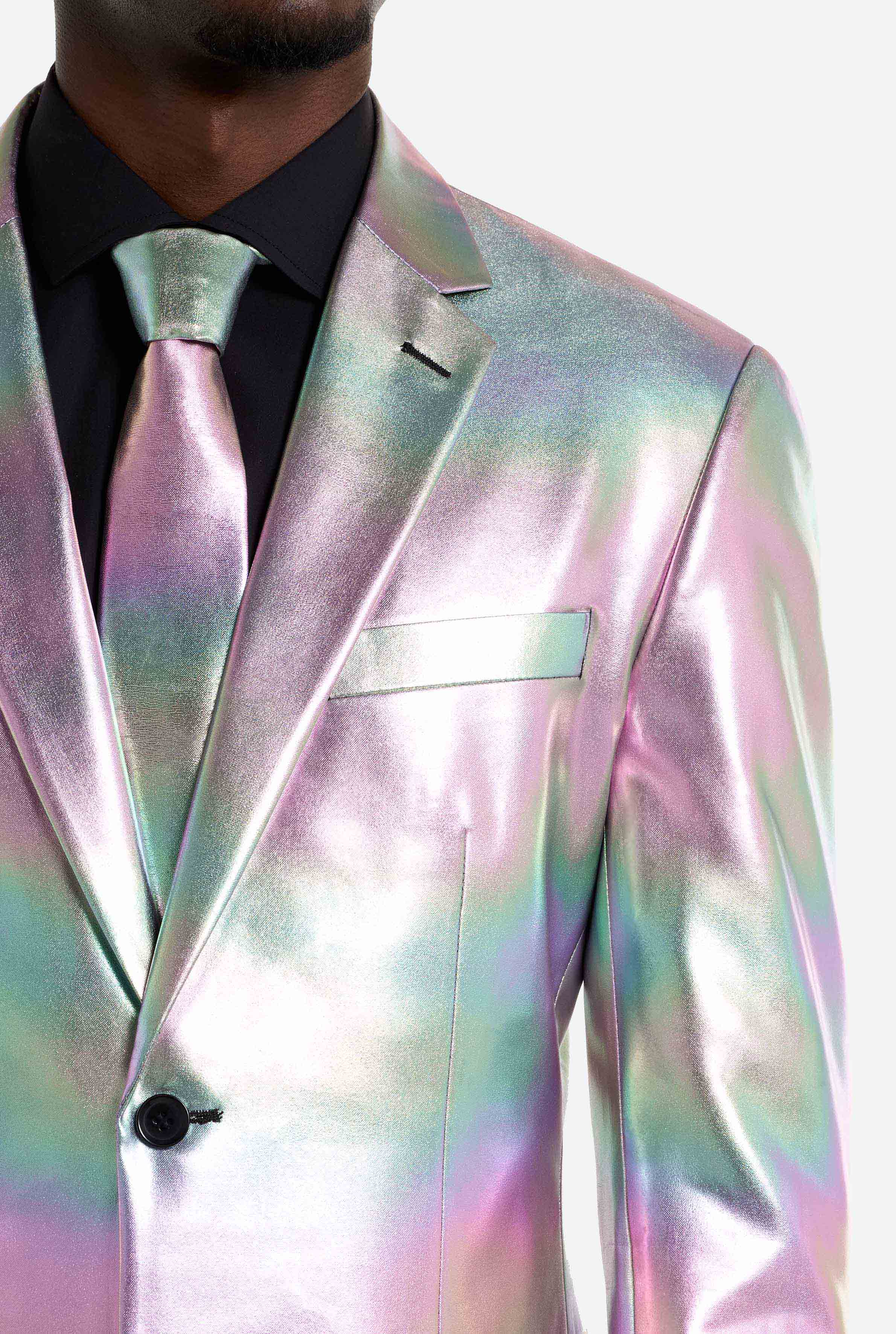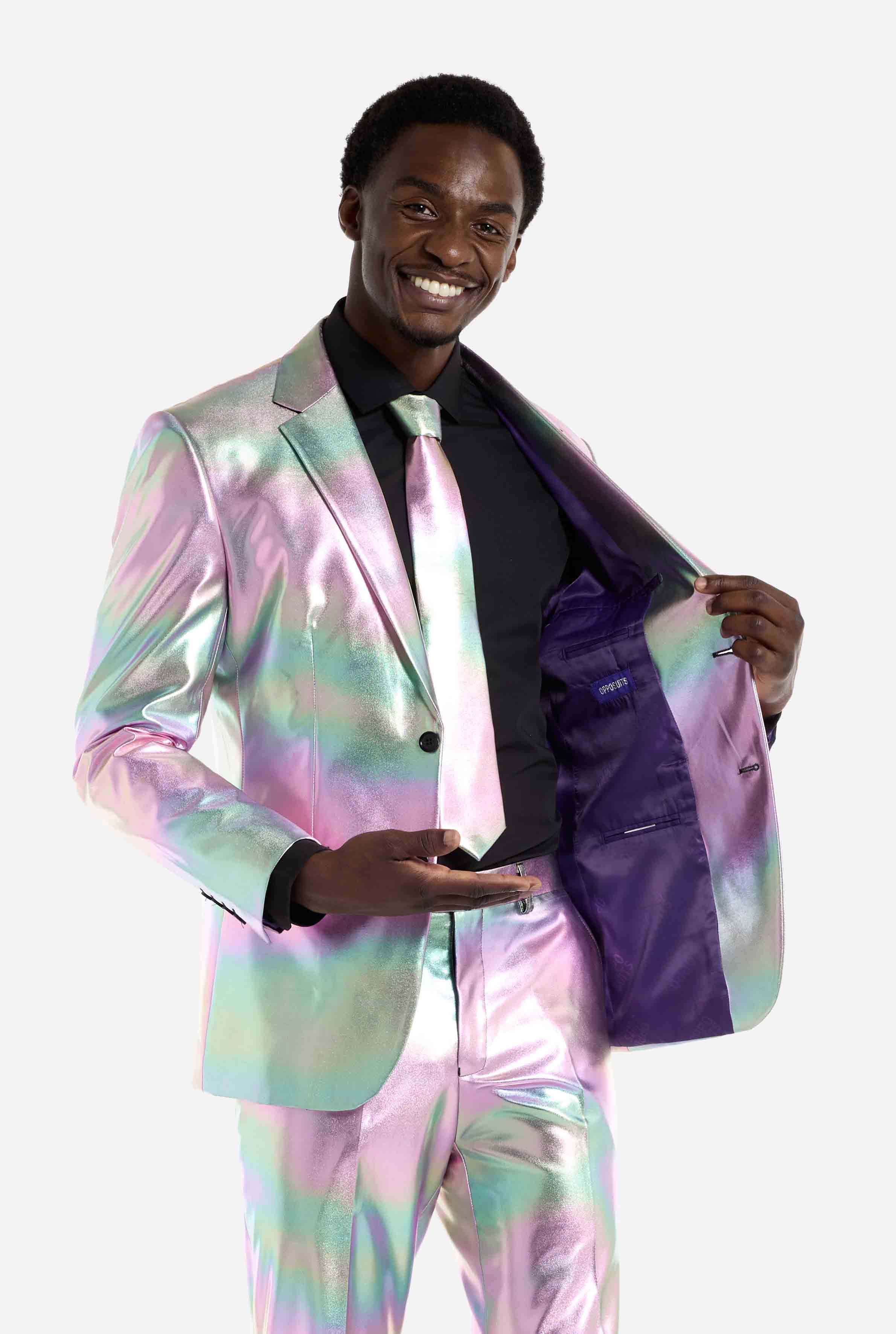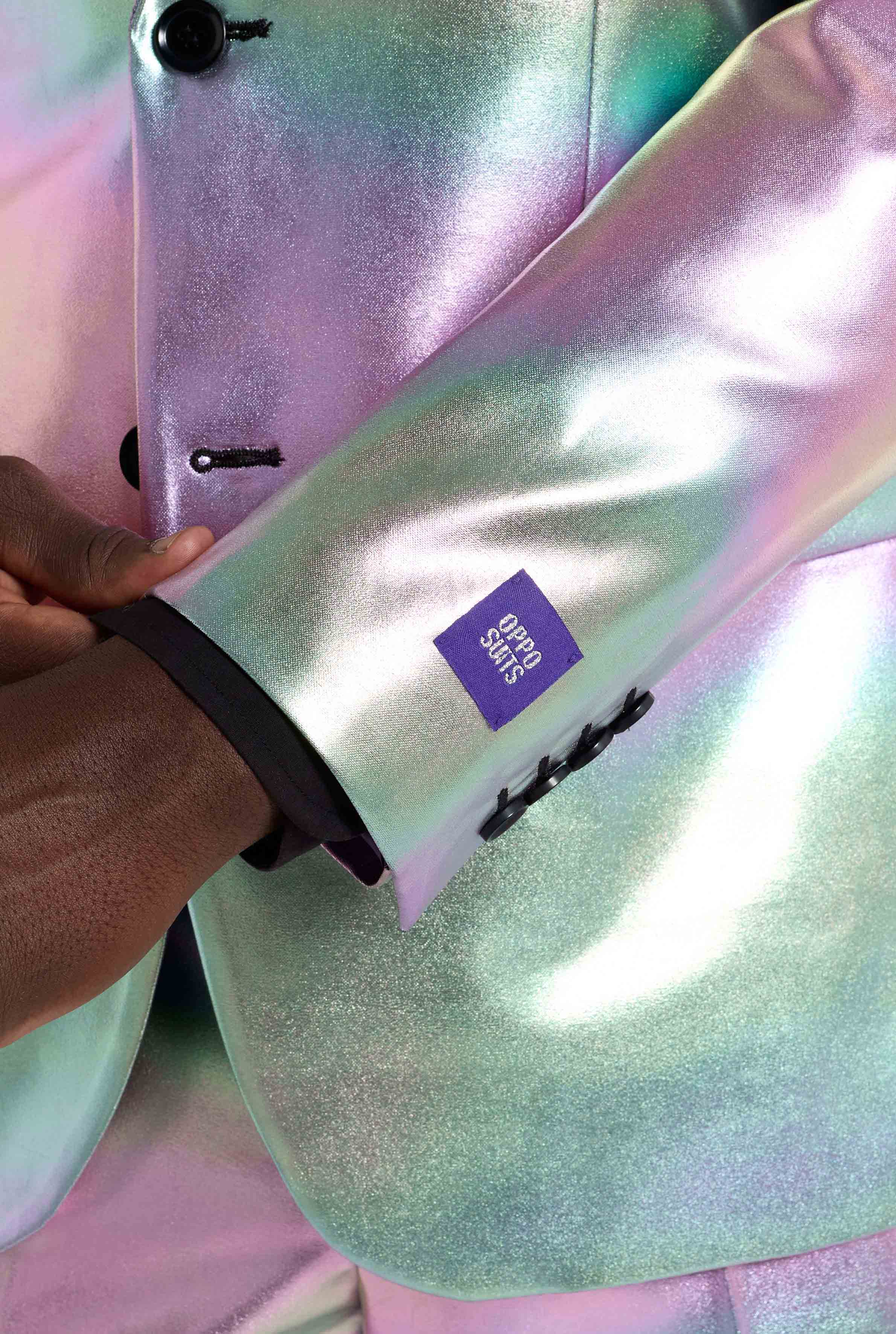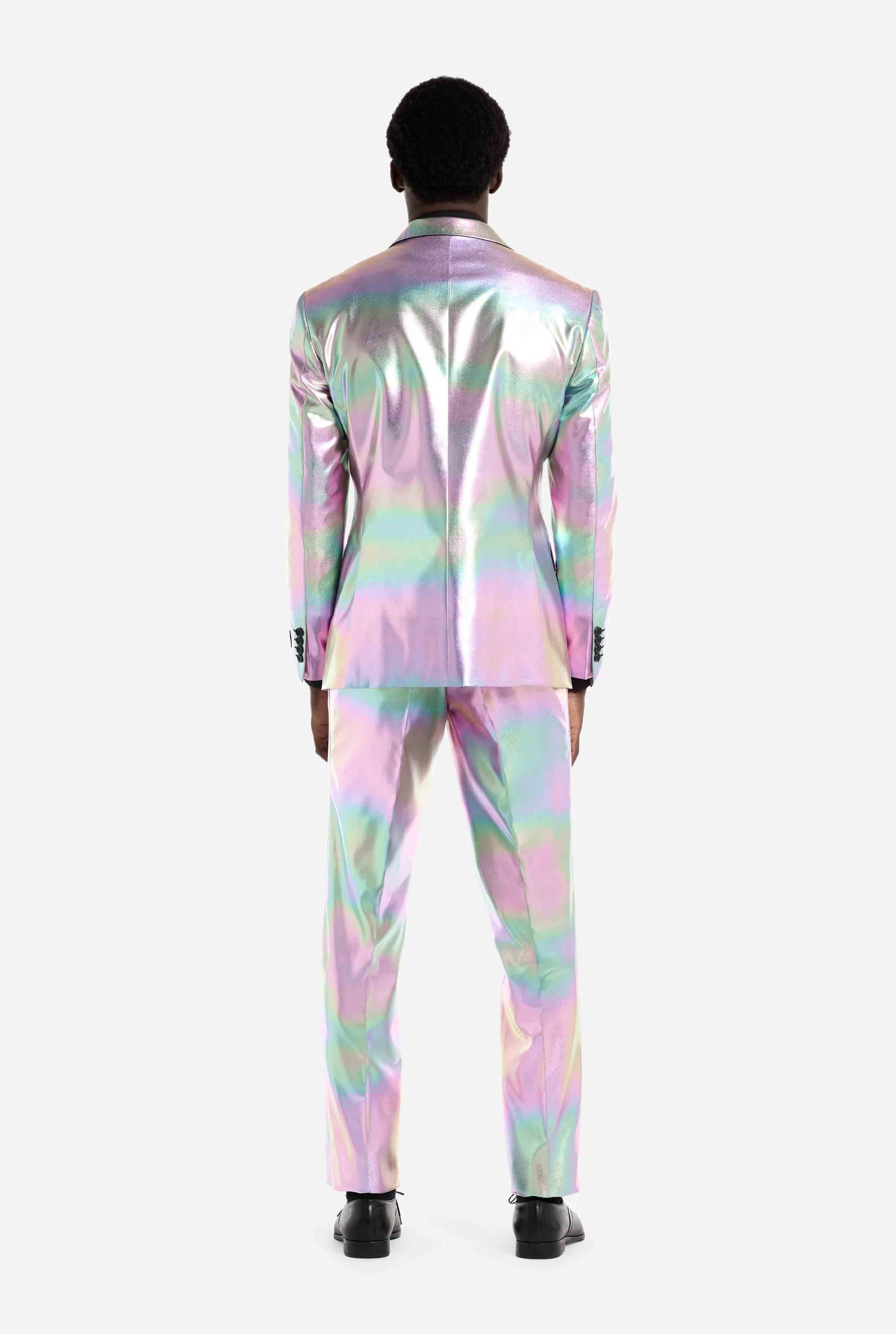 Dieser irideszente Anzug überzeugt durch seinen perlmuttartigen Glanz, der zwischen sanften Pastellfarben und metallischen Tönen wechselt. Unter Partylichtern, auf der Tanzfläche oder bei Tageslicht, der Effekt ist spektakulär und macht diesen Anzug zu einem echten Hingucker. Ideal für Fans von holografischen Anzügen und auffälliger Mode.
