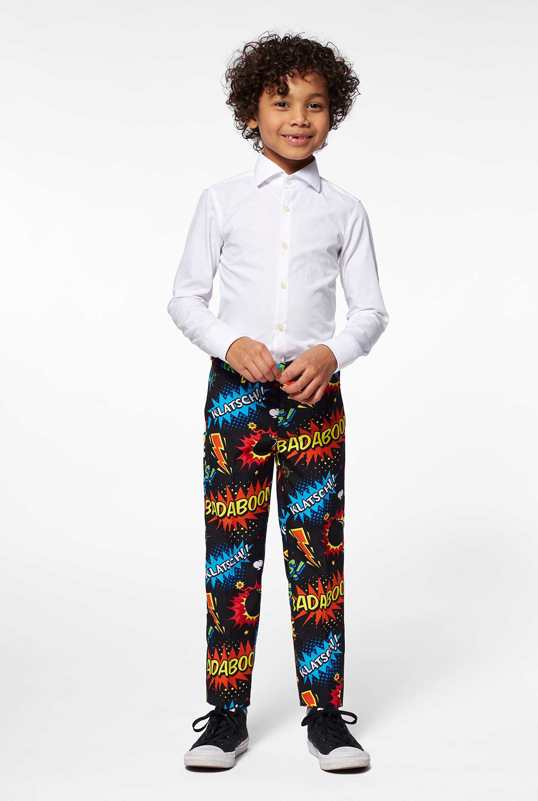Badaboom, Badabäng. Die Kinder hängen heutzutage zwar non-stop vor allen möglichen Bildschirmen, aber wir bei OppoSuits wissen, dass Comics niemals out sein werden. Auch die Kleinsten werden diesen coolen Anzug mit Comic-Muster tragen wollen.