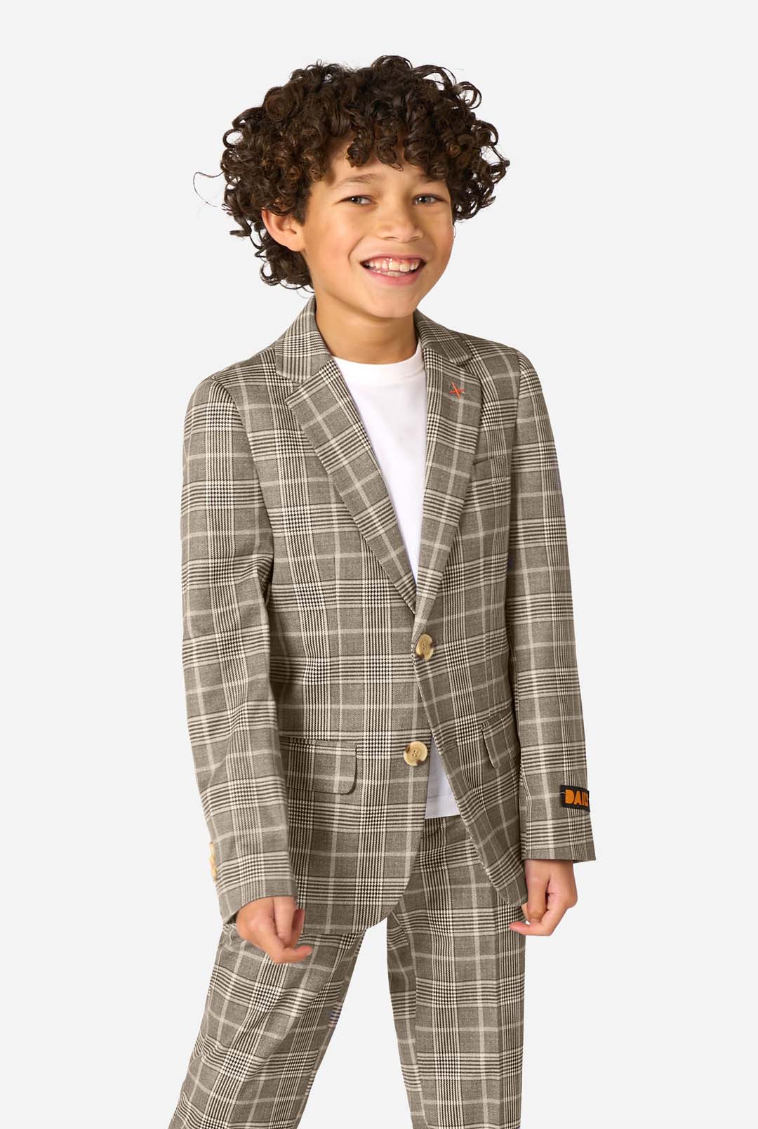 Ein Teenager, der einen hellbraunen karierten Anzug mit einem weißen Hemd trägt. Der Anzug hat eine moderne Passform mit zwei Knöpfen und Pattentaschen. Er steht vor einem schlichten weißen Hintergrund.