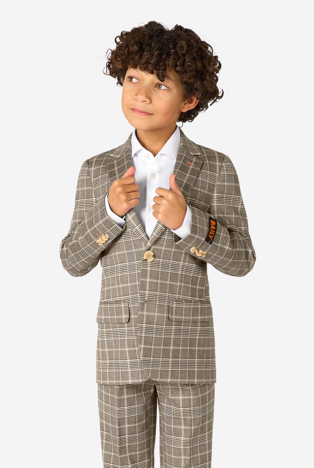 • Ein Junge trägt einen hellbraunen karierten Anzug und ein weißes Hemd. Der Anzug hat eine moderne Passform mit zwei Knöpfen und Pattentaschen. Er steht vor einem schlichten weißen Hintergrund.
