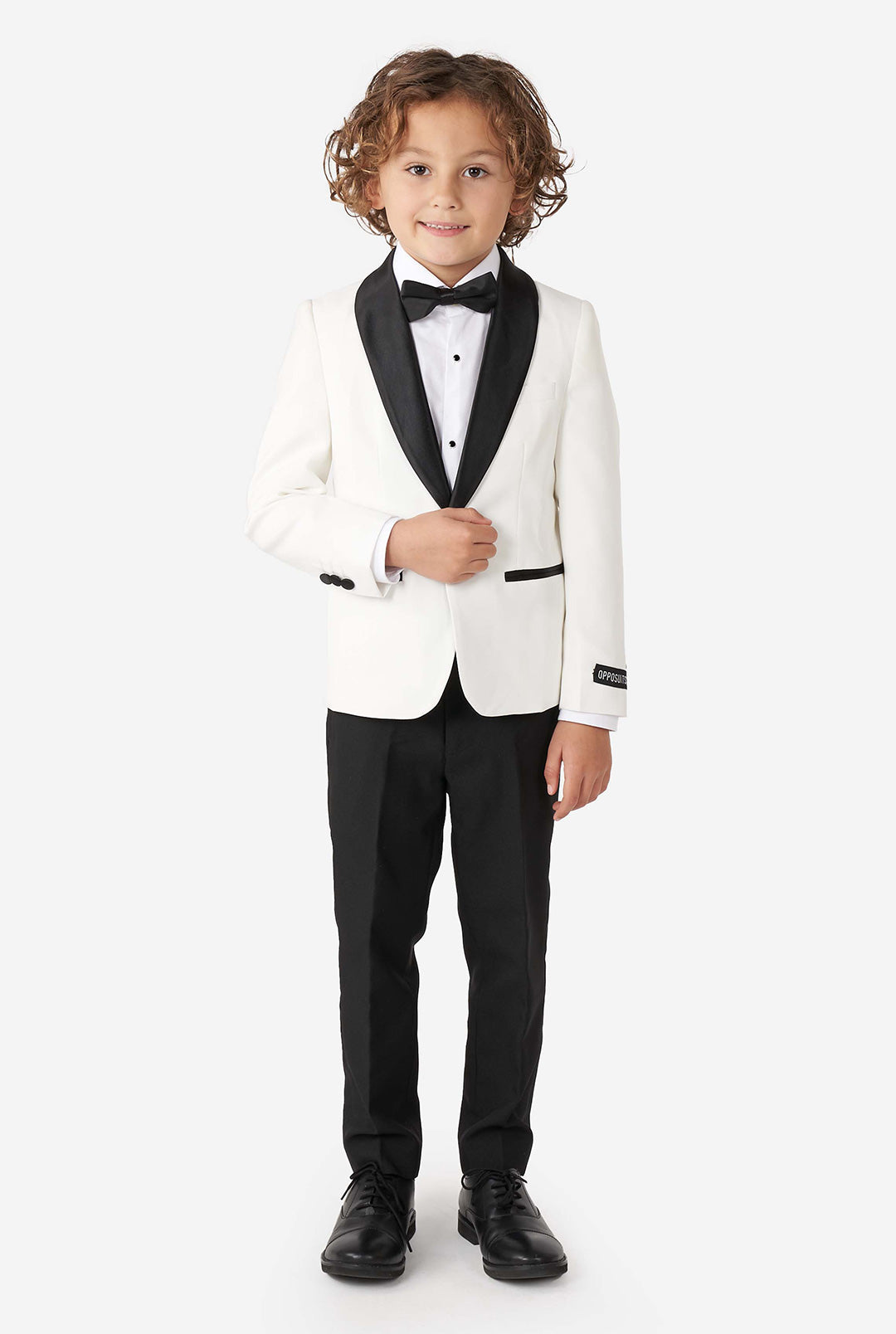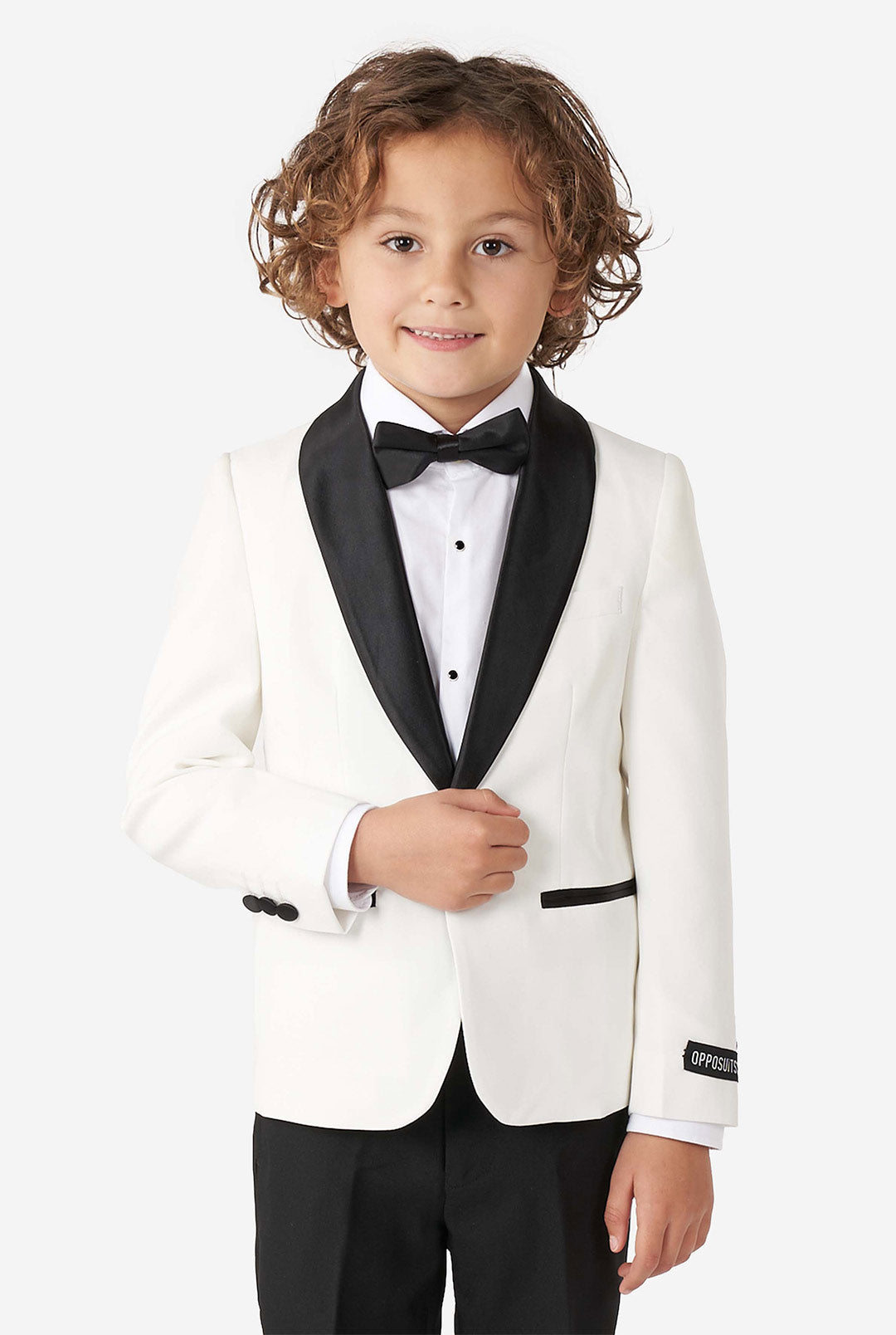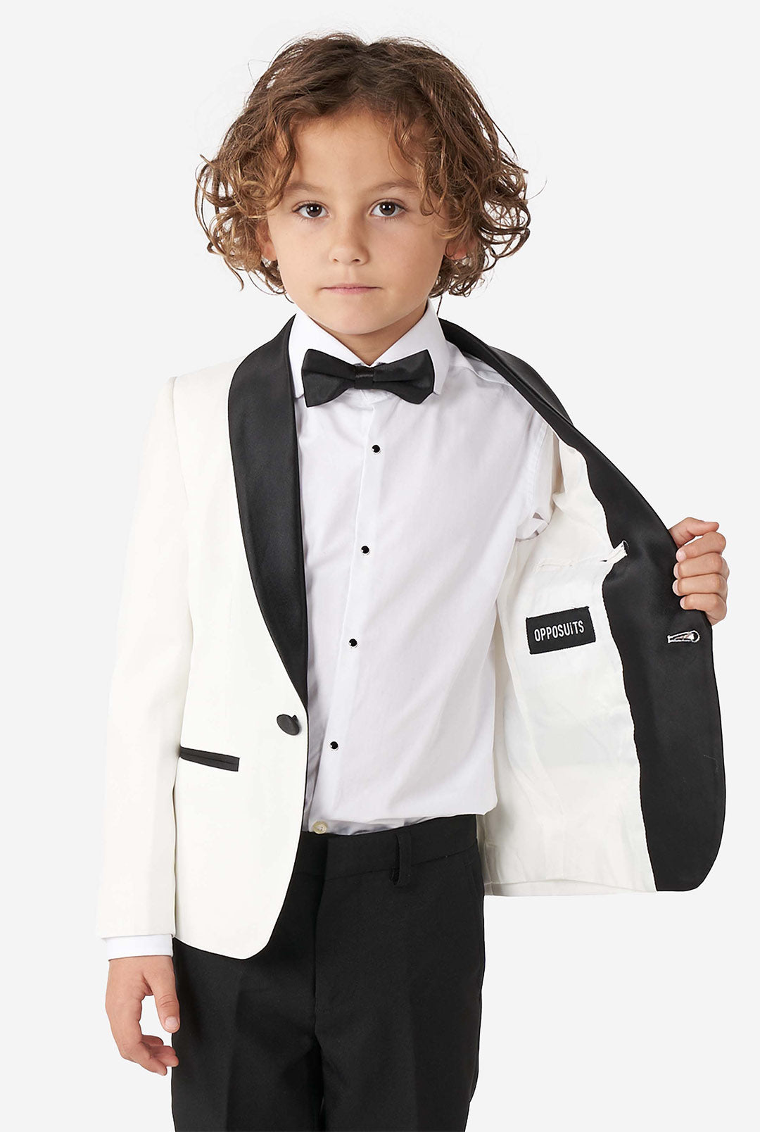 • Kind trägt einen weißen und schwarzen Smoking, Nahaufnahme