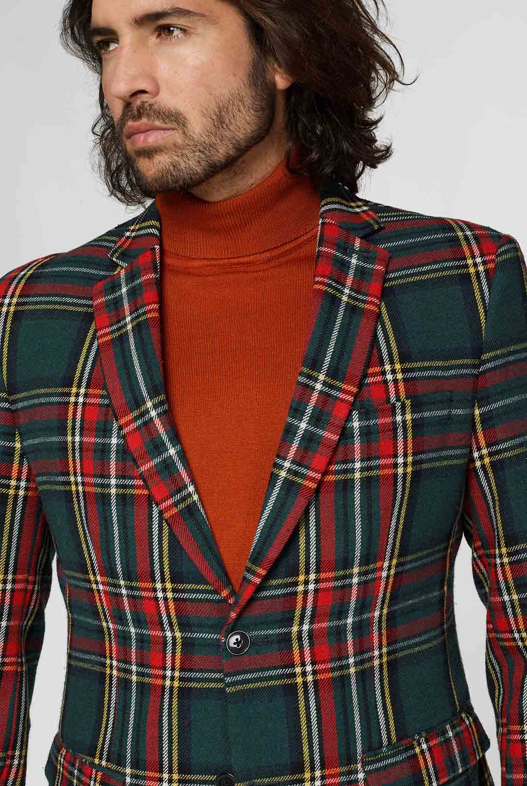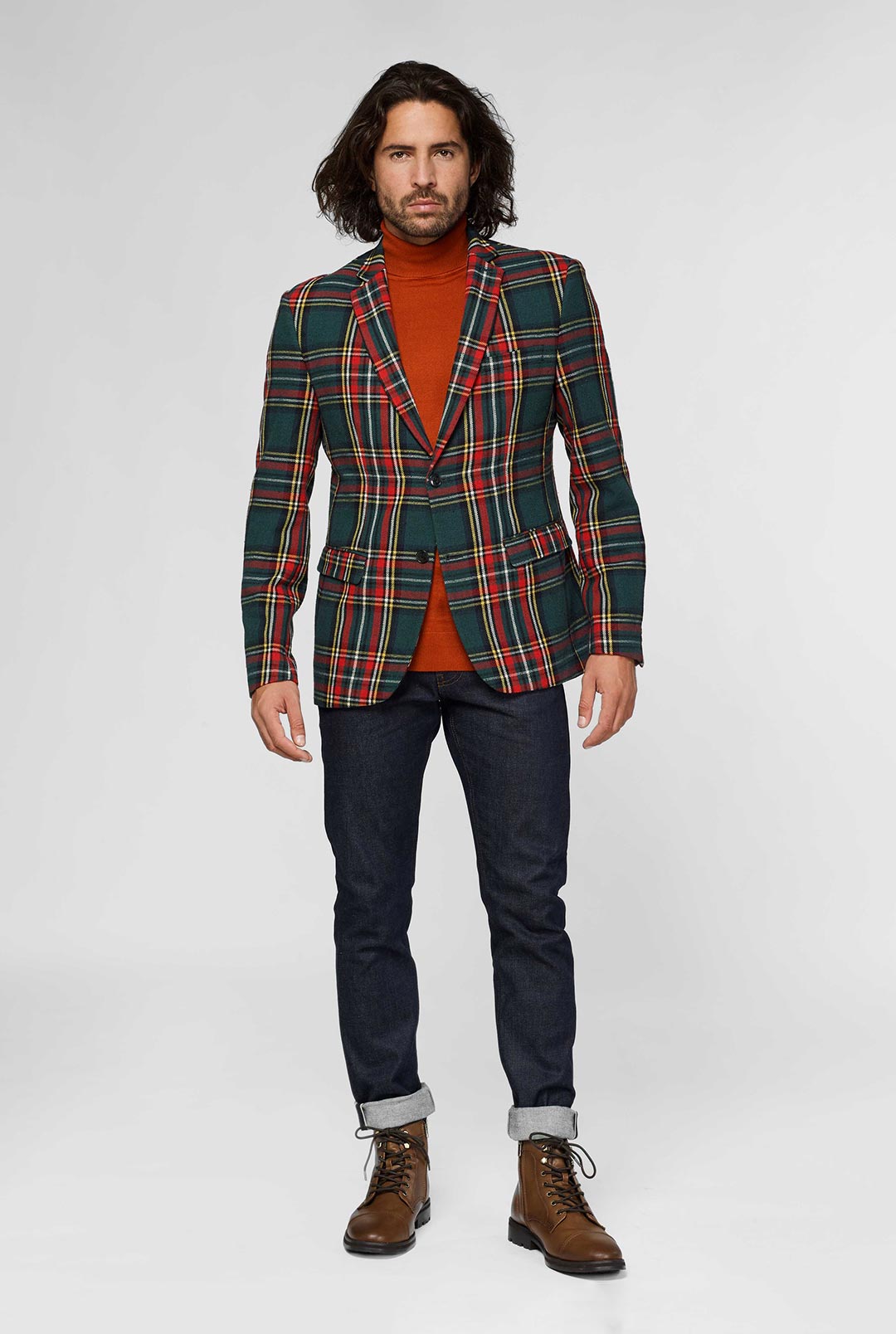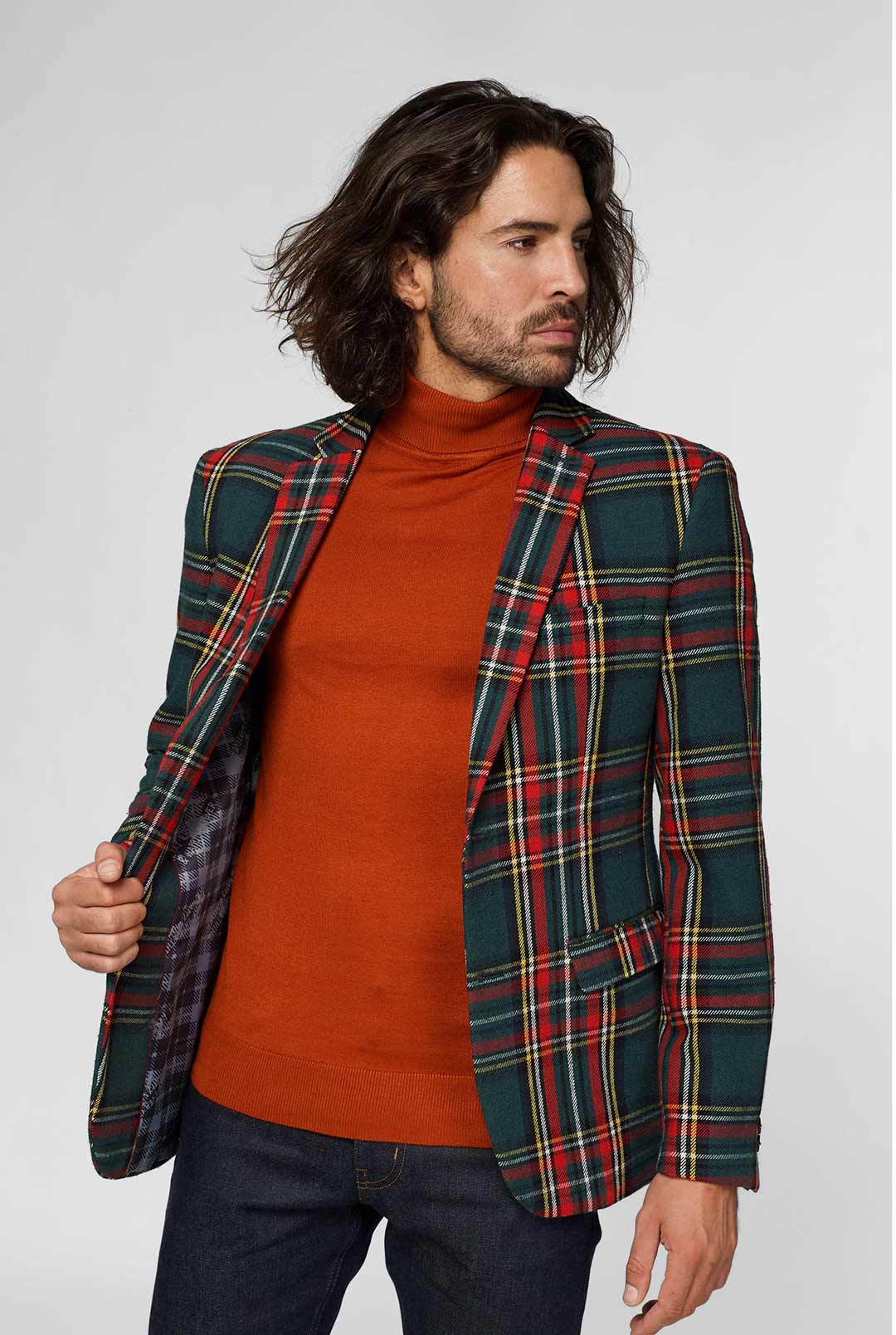 Tartan ist ein moderner und cooler Look, der dir das Selbstvertrauen gibt, deine Persönlichkeit während der festlichsten Zeit des Jahres auszudrücken. Dieser funky OppoSutis Deluxe Blazer aus Wolle hat ein klassisches Karomuster und ein Statementfutter mit "Merry everything & happy whatever".