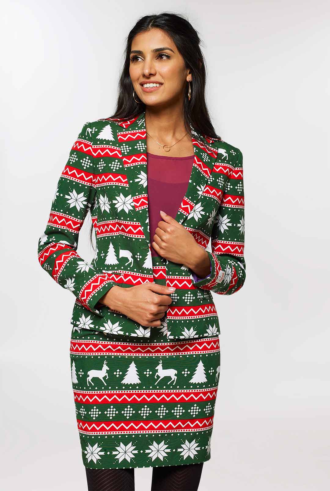 Traust du dich, diese Ferienzeit mit diesem festlichen Frauenweihnachtsanzug anders zu sein? Ob du dein erstes Weihnachtsessen mit der Schwiegerfamilie hast oder zur Firmenweihnachtsfeier gehst, dieser Anzug ist sicher ein Hit und ein Gesprächsstarter für alle Arten von Feiertagsanlässen