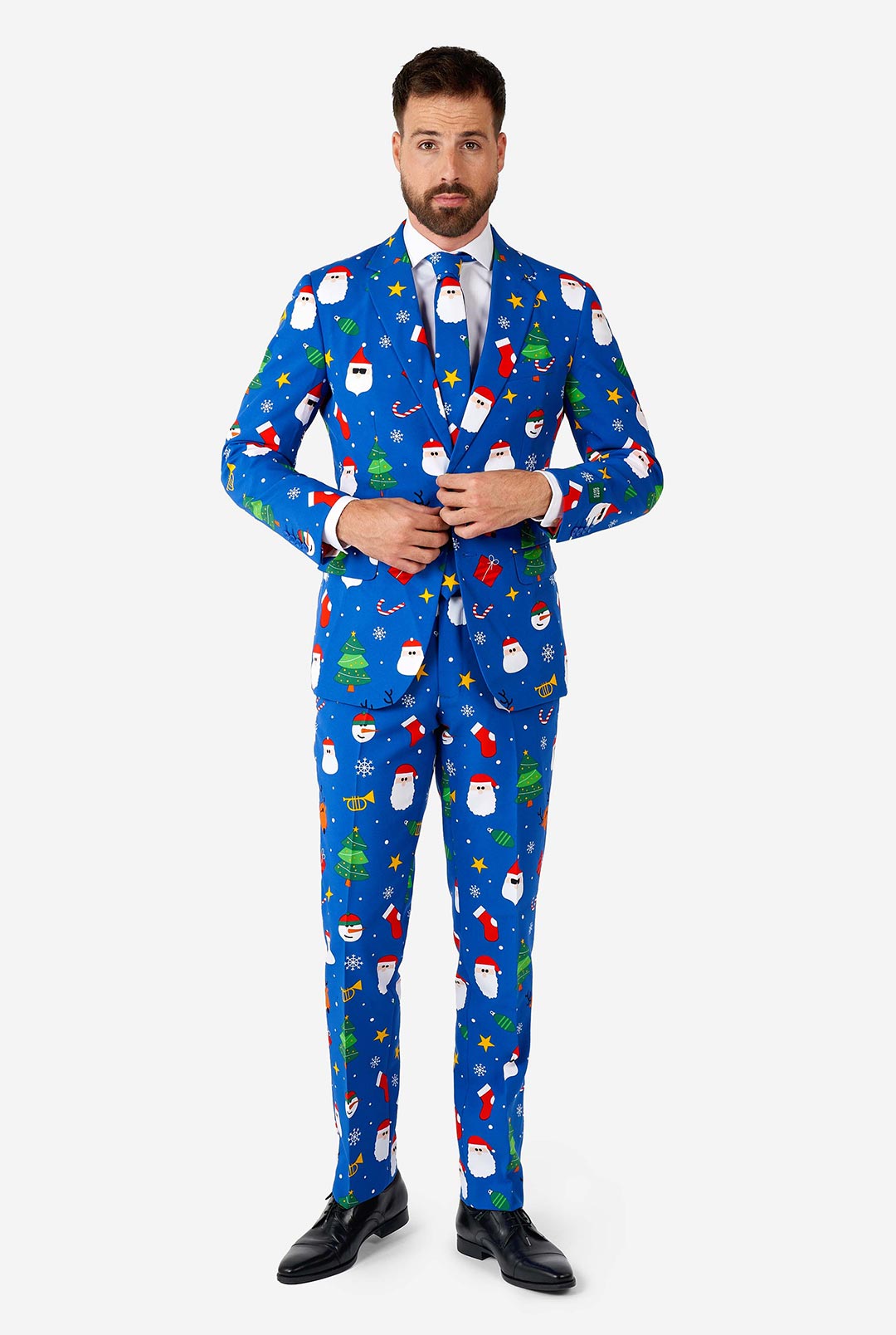 Weihnachten ist immer eine wunderbare Zeit, gefüllt mit Freude, gemütlichen Nächten und vielen Geschenken. Wenn Sie einen festlichen Look für die Feiertage brauchen, dann ist der blaue Festivity Weihnachtsanzug genau das Richtige für Sie. Er zeigt den Weihnachtsmann, Rentiere, Tannenbäume und glitzernde Sterne. Es ist der festlichste Look, den du je hattest, und er wird dich als jährliche Belohnung fest auf die "gute" Liste des Weihnachtsmanns setzen.