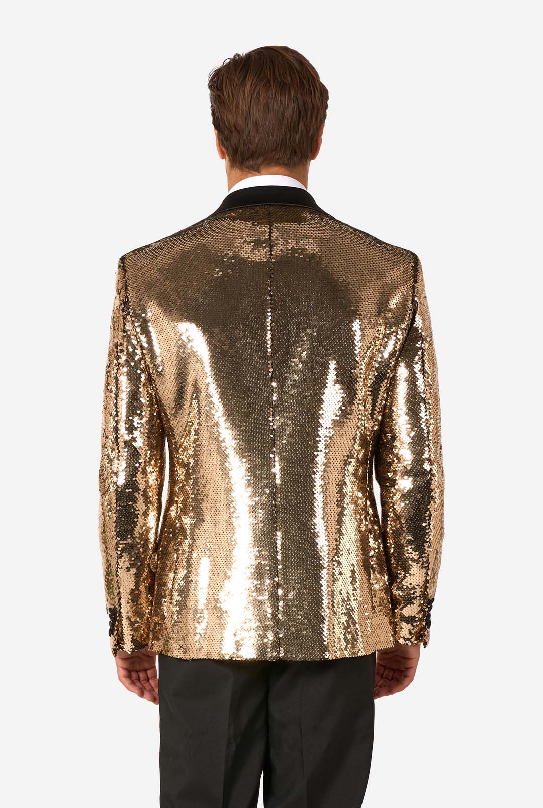 • Ein Mann trägt eine glänzende, goldene Jacke mit Pailletten und schwarzen Satin-Umlegekragen.