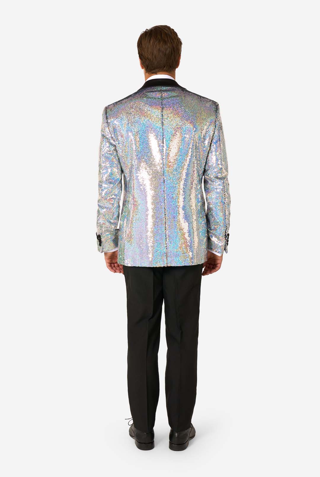 Treten Sie mit diesem glänzenden Tuxedo ins Rampenlicht. Die holographischen Pailletten sind für Menschen, die einen Cyber-Chic- und Futuristic-Stil benötigen. Mit einem eleganten Satin-Schal-Revers und gepaart mit klassischen schwarzen, plissierten Hosen schlägt dieser Pailletten-Tuxedo die perfekte Balance zwischen Raffinesse, Klasse und unverkennbarem Flair.