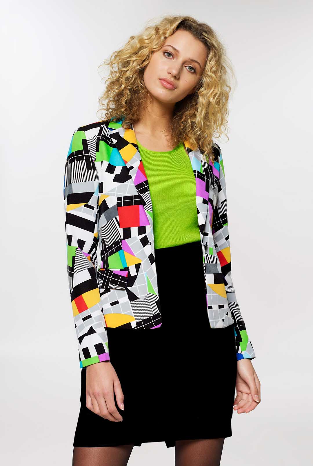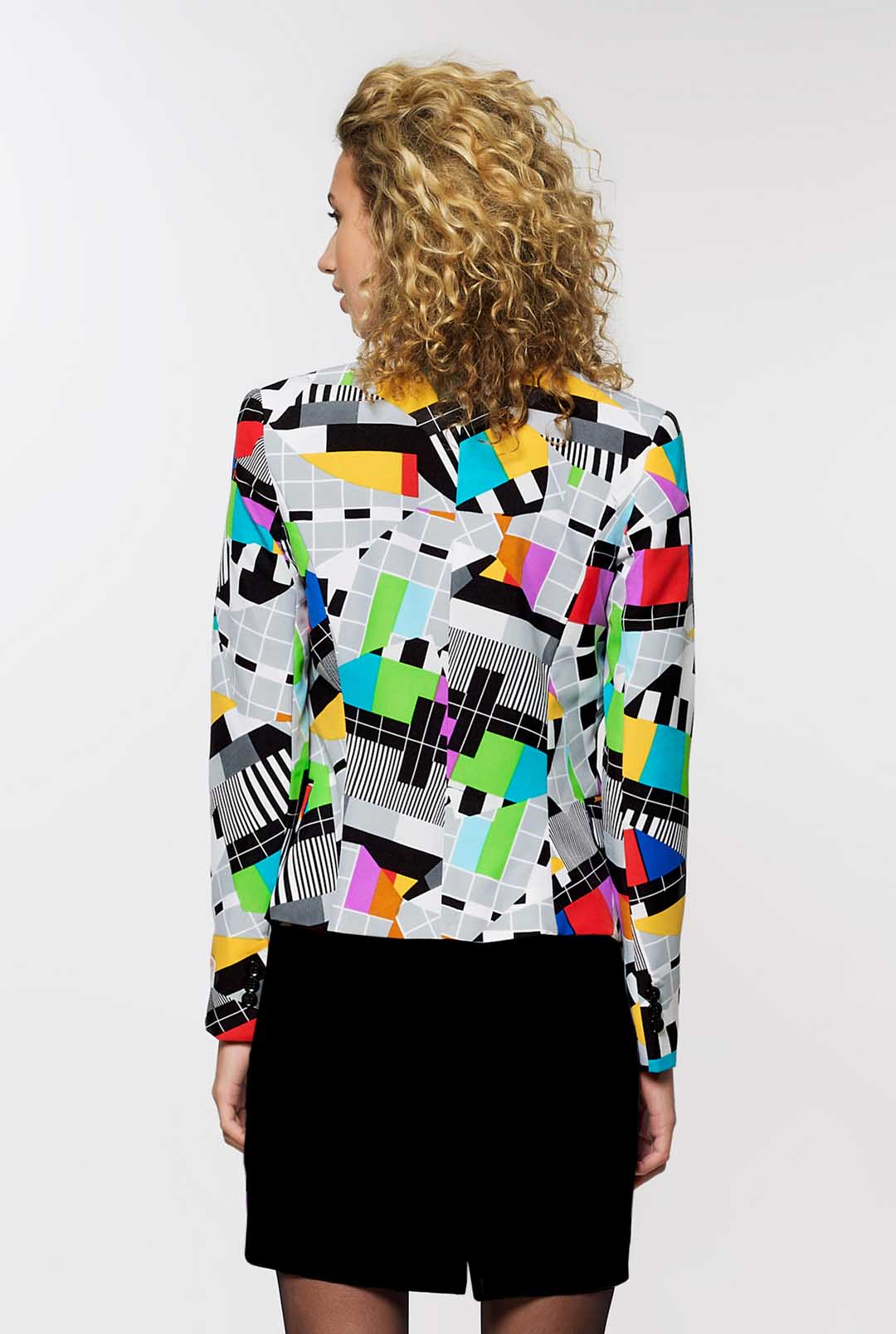 Wenn Retro Ihr Ding ist, ist Miss Testival Ihr Outfit. Vielleicht erkennen Sie dieses Design an dem Testmuster, das man damals im Fernsehen sah. Dieser Damenanzug ist perfekt für Partys und Festivals, aber es macht uns auch nichts aus, wenn Sie ihn während Ihrer Netflix & Chill-Session tragen.