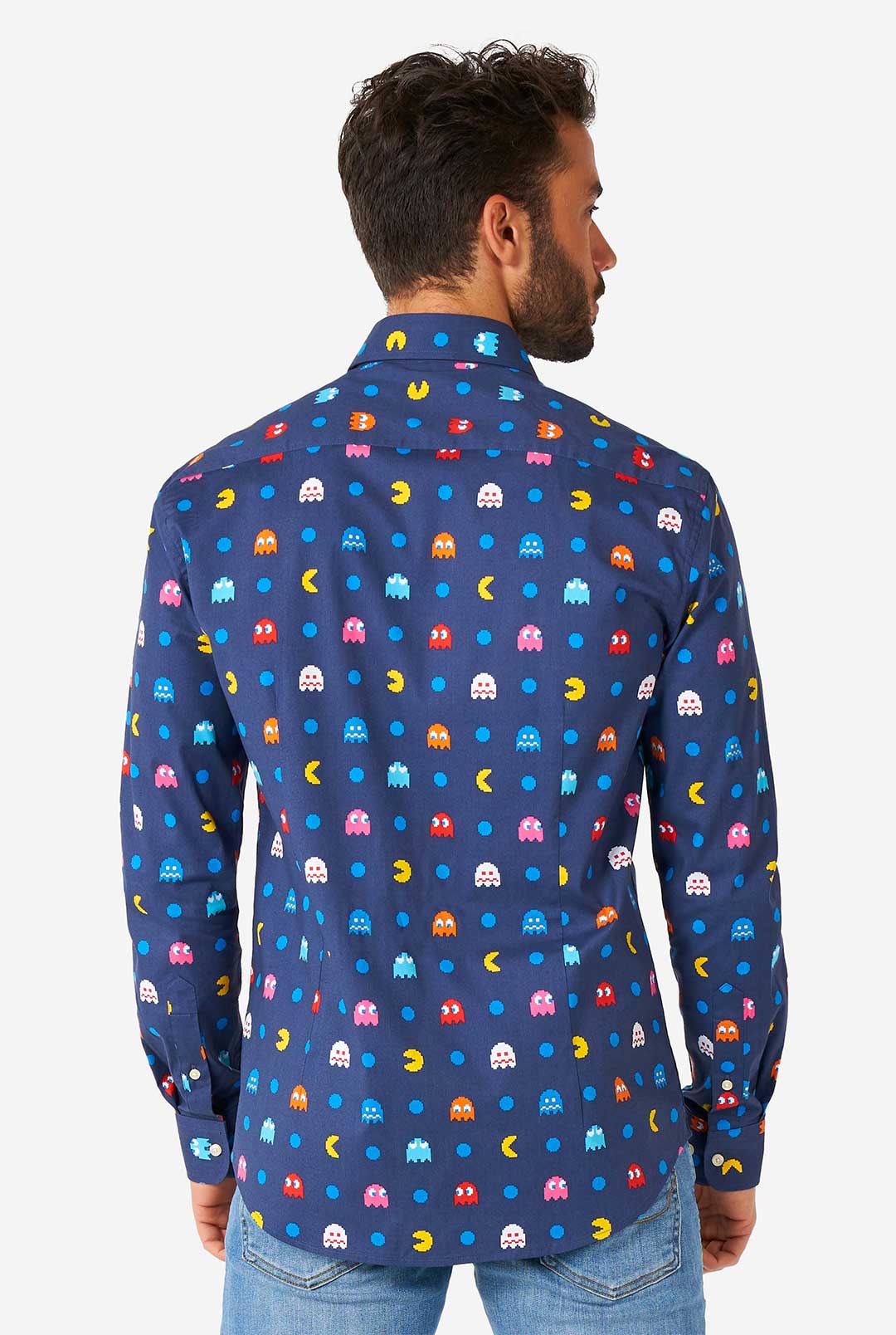 • Mann trägt blaues Hemd mit Pac Man -Ikonen