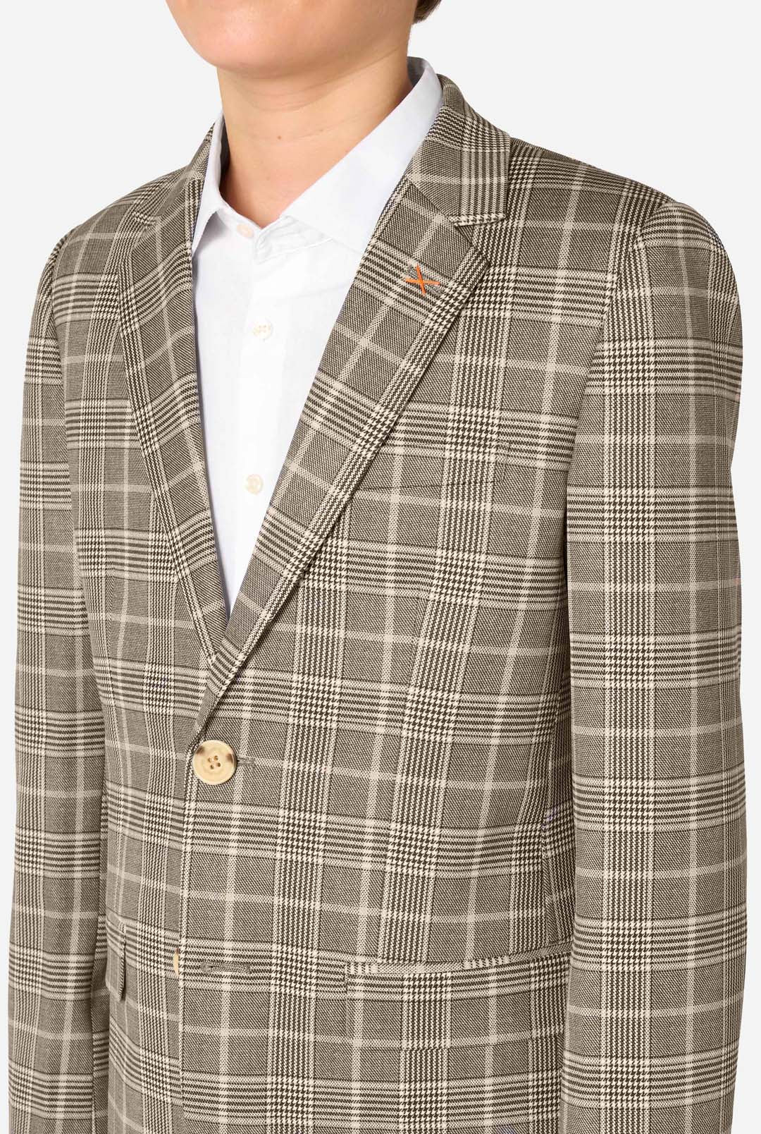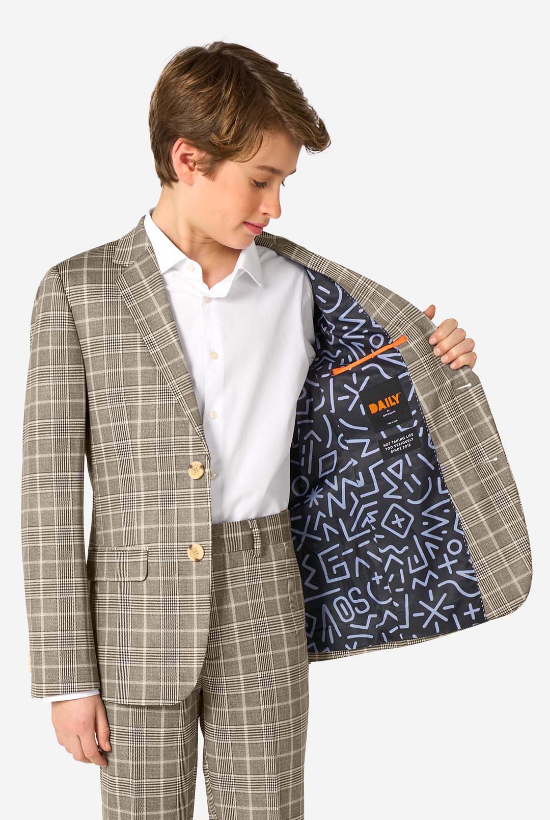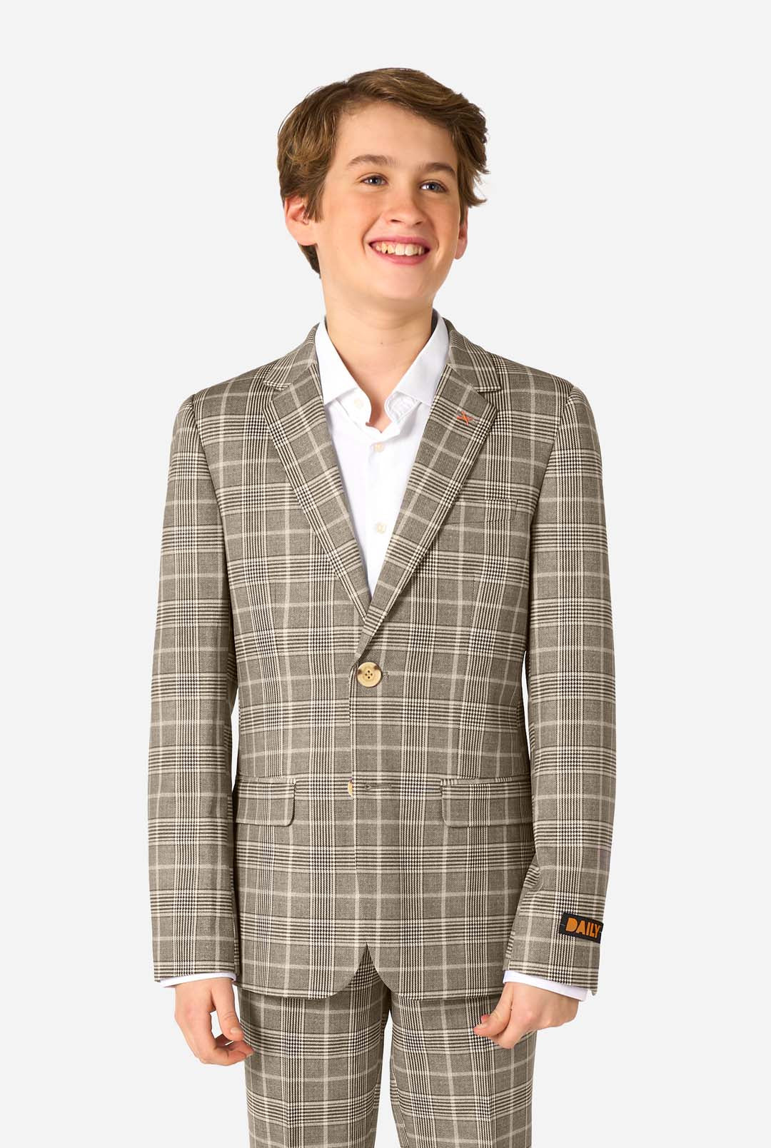 Ein Junge trägt einen hellbraunen karierten Anzug und ein weißes Hemd. Der Anzug hat eine moderne Passform mit zwei Knöpfen und Pattentaschen. Er steht vor einem schlichten weißen Hintergrund.