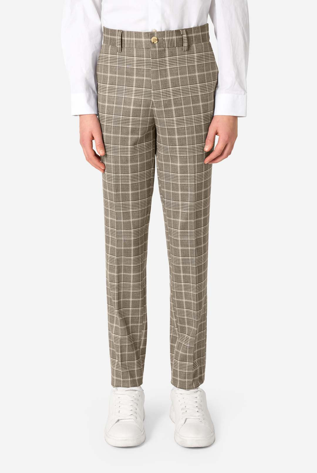 • Ein Teenager, der einen hellbraunen karierten Anzug mit einem weißen Hemd trägt. Der Anzug hat eine moderne Passform mit zwei Knöpfen und Pattentaschen. Er steht vor einem schlichten weißen Hintergrund. Nahaufnahme der Hose