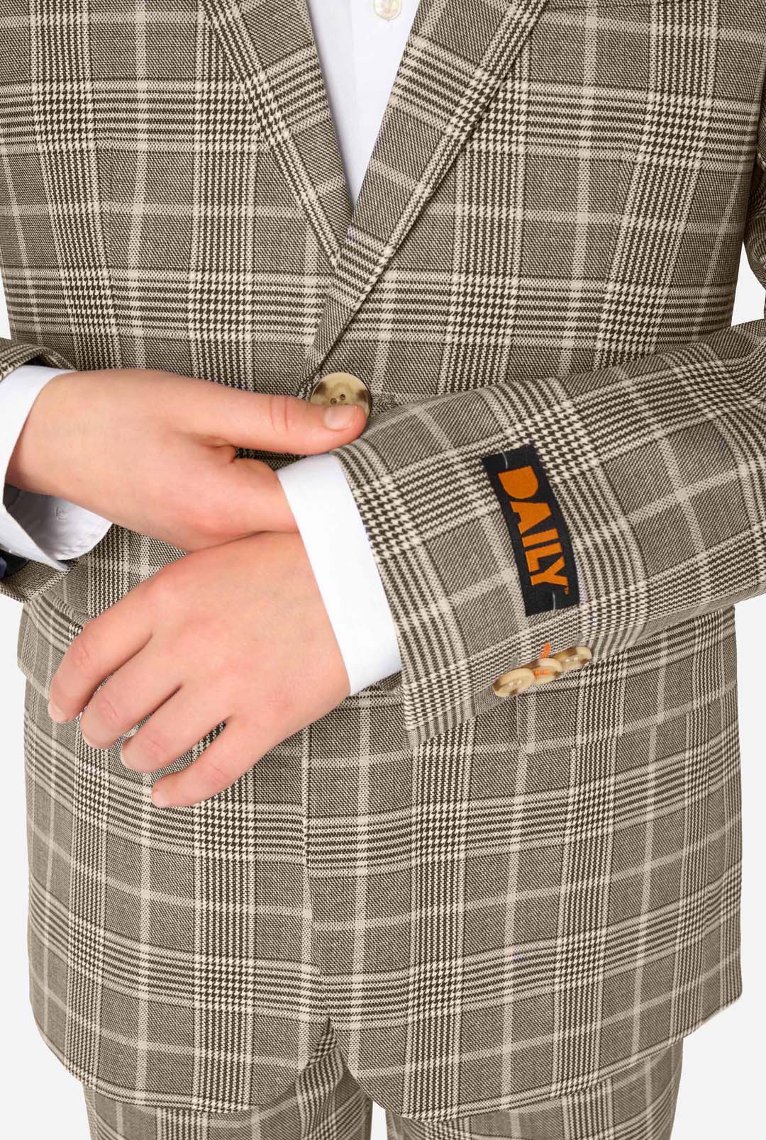 • Ein Teenager, der einen hellbraunen karierten Anzug mit einem weißen Hemd trägt. Der Anzug hat eine moderne Passform mit zwei Knöpfen und Pattentaschen. Er steht vor einem schlichten weißen Hintergrund. Nahaufnahme der Ärmel