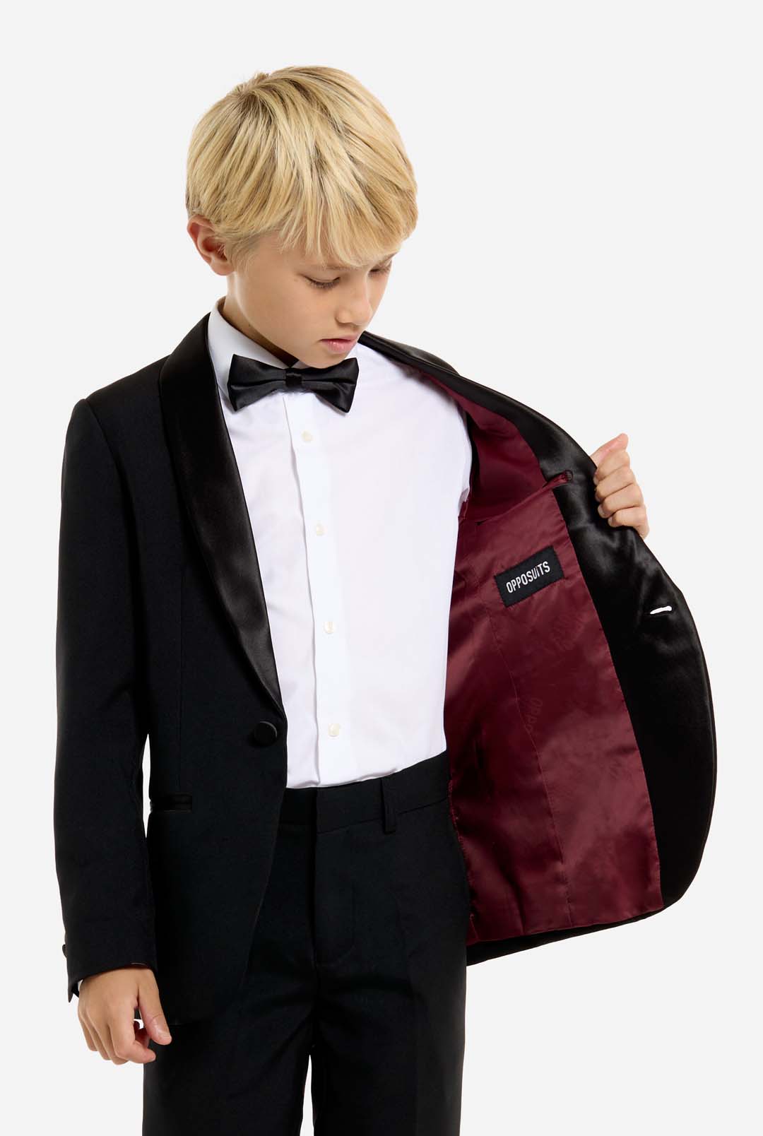 Dieser zeitlose schwarze Smoking ist selbst für die coolsten Jugendlichen voller Eleganz. Kombiniert mit einer schwarzen Smokinghose mit doppelter Bundfalte und einer Fliege wird Ihr kleiner Mann auf der nächsten Familienfeier ein absoluter Hingucker sein.