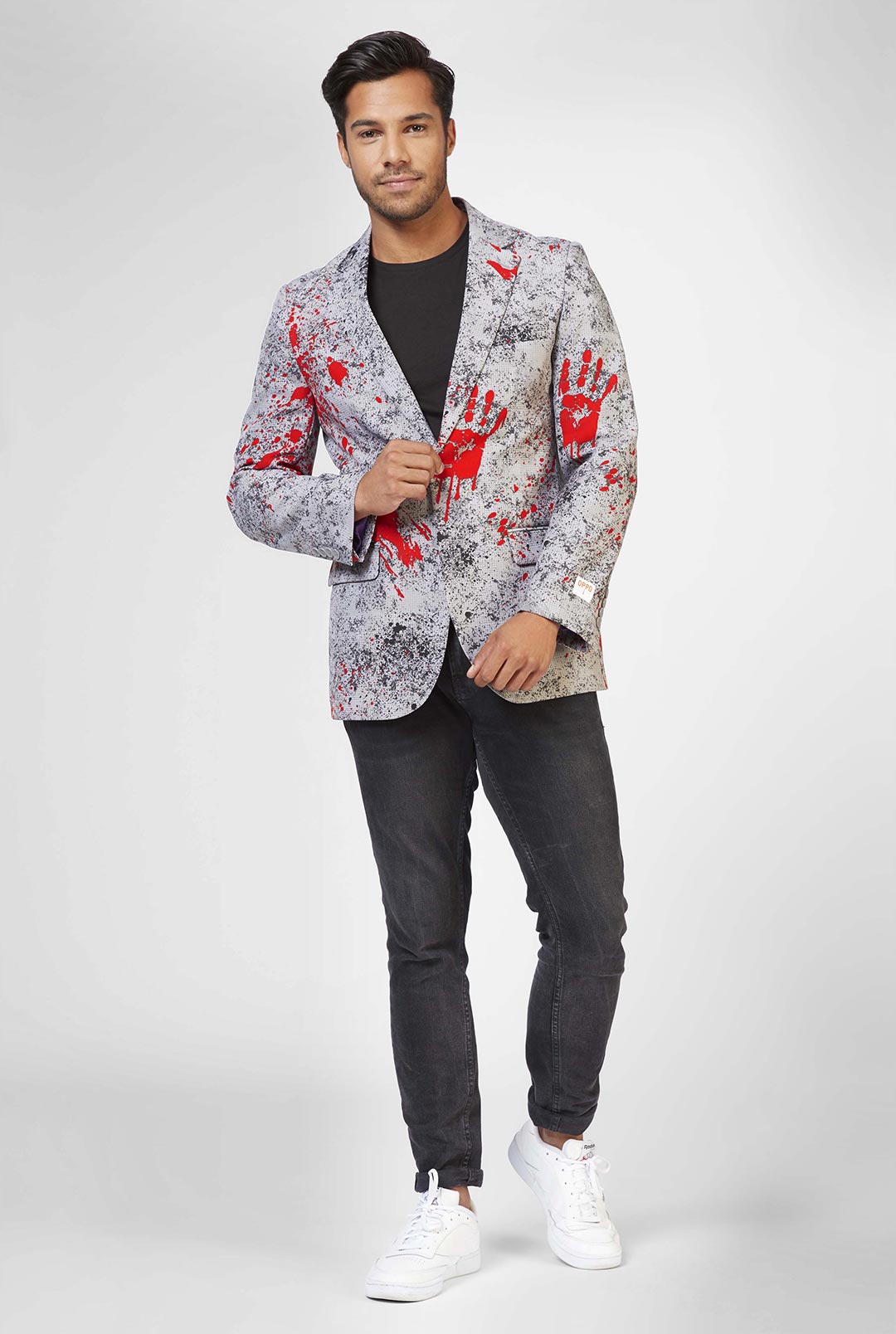 • Männer, die graue Halloween -Blazer mit Blutflecken tragen